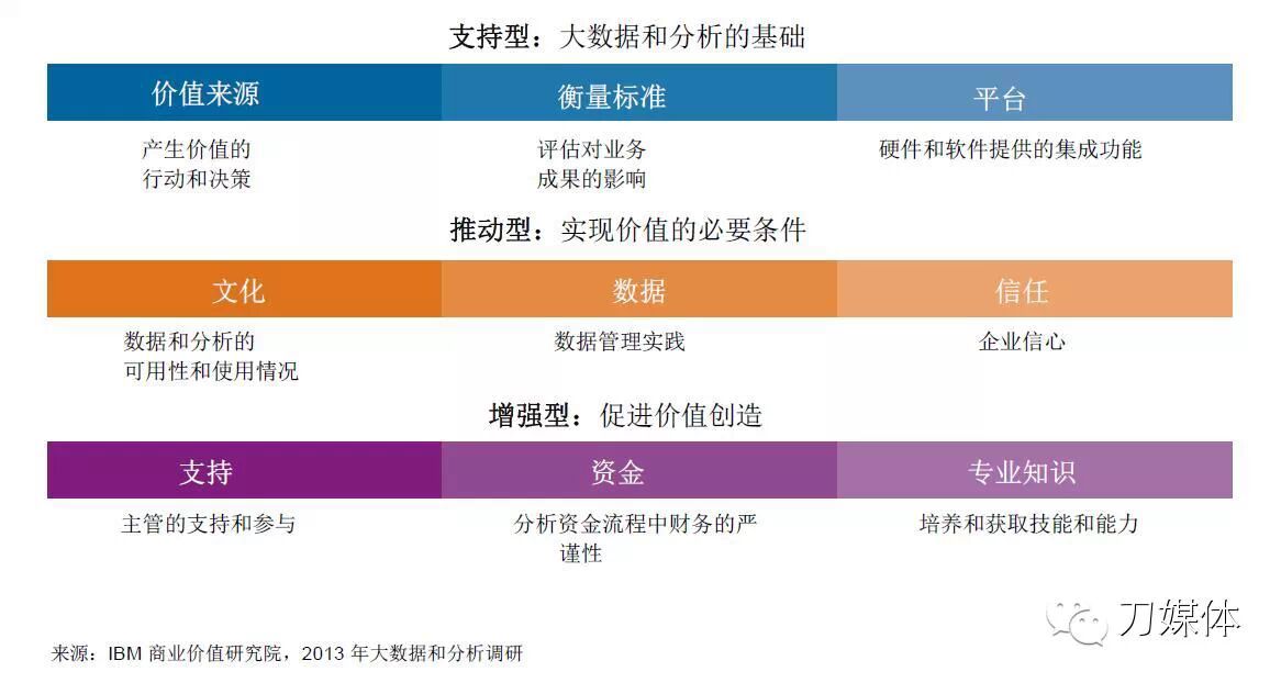 在该研究中,IBM调研了70多个国家或地区的900多位业务和IT高层主管。通过研究发现了如下图中所示的9大支持因素,可以帮助企业从各种来源中不断增加的数据获得洞察,通过分析这些数据在企业各个层面采取行动,从而创造出非凡的价值。这9大因素代表了能够最有效区分领先者与其他受访者的差异化能力。结果表明,领先者实现9大要素的方式基本类似,即利用分析创造价值。