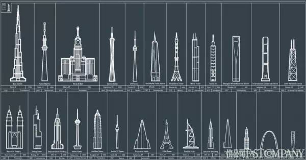 这幅图表由以创作数字化信息图表海报著称的图表研究室Pop Chart Labs制作,Pop Chart Labs团队用图表和手绘建筑结构模式展现了这些被设计师们尊为“人类史上90个最伟大成就的建筑”。图表按照建筑的高度排列,展示了从古至今史上最了不起的建筑,包括新石器时代的石堆纪念碑,帕台农神殿。还有一些当代的建筑,比如说伦敦造型奇特的“小黄瓜”(Gherkin)和哈利法塔,白宫也名列其中。