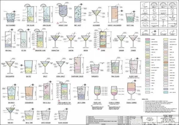 工程师山恩·赫尔利(Shaan Hurley)用AutoCAD软件制作了一款调酒教程。在图表中,赫尔利解构了包括汤姆柯林斯(Tom Collins )和激情海滩(Sex on the Beach )在内的70种不同鸡尾酒的做法。图表按是否含有威士忌分类,可以下载下来用AutoCAD查看。