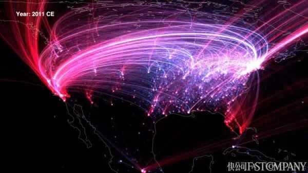 美国东北大学的研究员绘制了一张欧洲、北美文化、文明迁移史的图表。在图表中,我们可以直观得看到一个地方在什么时候是文化、文明鼎盛的时期。除此之外,图表中还分别用蓝色和红色标注了两千年来150,000多位欧洲和美国知识分子出生和过世的时间,并在地图上绘出轨迹。这些知识分子是人类文明的启明灯,为了纪念他们,图中的轨迹也是用光束来表现的。