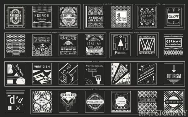 Pop Chart Lab是数字化信息图表界的佼佼者,总能做出令人叹服的图表,这张平面设计史图表也保持了它们一贯的出品水准。这张黑白网格图表简直就是个平面设计的微观史。图中从古至今记录了各种各样的设计流派,从维多利亚时期的到现代的(包括鲍豪斯建筑学派、旋涡主义画派、风格派、新文字设计、动态布局、构成主义、绝对主义和未来主义等),再到当今流行的扁平化设计。每种设计流派下面都备有文字说明,给设计初学者入门和爱好者提供了一个非常好的入门资料。