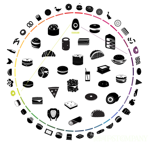 近年来,混搭料理风靡全球,厨师和商家的创意想法让我们可以在一样食物中尝到不同的风味。Co.Design的信息设计师莉莉·泰德哈尔(Lily Tidhar)做了一个食物“杂交”趋势图表,想象一下把甜甜圈、汉堡包、火鸡、寿司放在一块是什么呢?看起来非常不搭调的食物放在一起可能会产生一种奇怪的美感。图表中的各种组合看起来非常奇妙,也很吸引人,泰德哈尔还为每个组合出来的新品种食物起了名字。