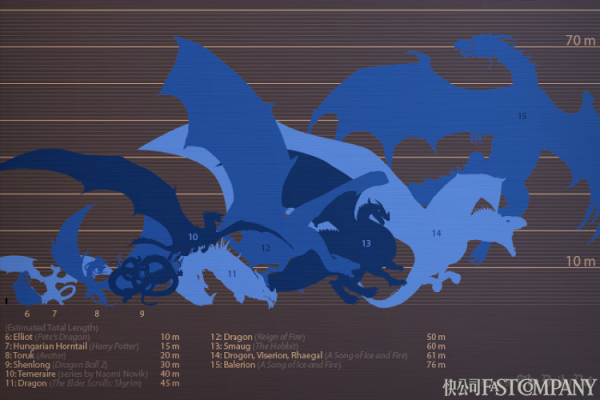 如果《霍比特人》中的史矛革(Smaug)巨龙与《权利的游戏》中的贝勒里恩(Balerion)一决高下谁会胜出呢? 为了能直观地比较影视、文学作品中的神龙战斗力, The Daily Dot 的考究帝们对不同作品中的龙一一进行了研究, 从《花木兰》里花家的守护龙木须 (最小的), 《哈利波特》中的匈牙利树蜂, 再到《七龙珠》中的神龙, 作者马克斯·弗莱什曼(Max Fleishman)和费尔南多·阿方索(Fernando Alfonso)把这些龙按照身材从小到大排列,做出了神龙战斗力排行榜。