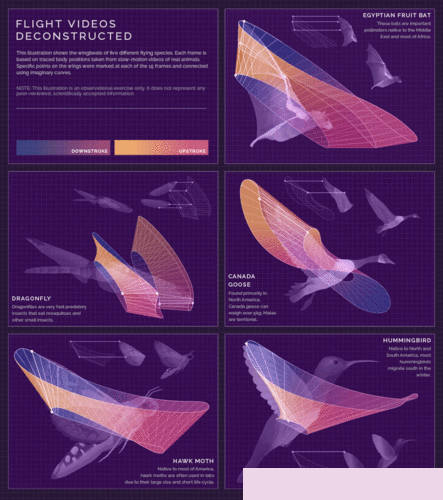 22岁的西雅图艺术家埃莉诺·卢茨(Eleanor Lutz)在大学的昆虫研究室工作室产生灵感创作了这一图表。卢茨用直观的图表展现了不同种类有翅膀的动物是如何飞行的,记录的动物包括蝙蝠、蜻蜓、黑额黑雁、蜂鸟和鹰蛾。卢茨仔细观察了这5种动物飞行时的慢动作录像,然后记录下飞行中每种动物翅膀关节的位移情况,这些位移很难直接用肉眼观察到。翅膀煽动最快的要数蜂鸟了,一秒钟大约会动200次。