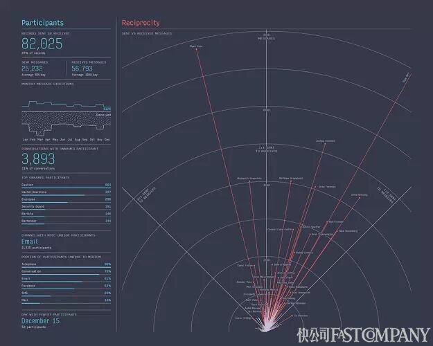 在2013年,一位执着于自我数据监控的狂人尼古拉斯·费尔顿(Nicholas Felton)记录下了在一年中他与其他人交流的所有数据,包括短信、Facebook留言、电话、邮件、平信、说话和肢体语言。经过汇总统计,他与其他人总共有94,842次接触,说了7,673,242个字。根据统计信息,费尔顿制作出了量化图表,让我们看到了现在通讯的惊人发展,用他自己的话说“我们的祖先肯定想不到通讯会变得如此发达。”
