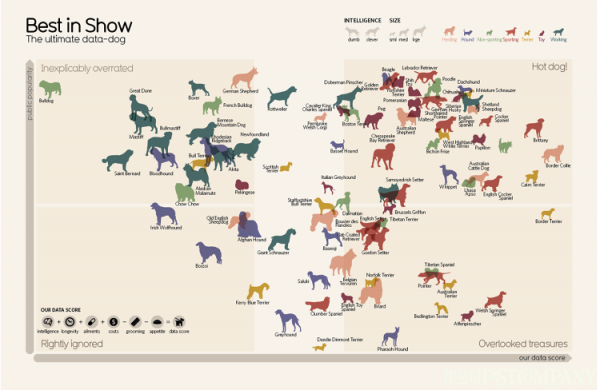 伦敦资讯类记者兼设计奇才大卫·麦克坎德莱斯(David McCandless)前些年创作了很多深刻的视觉化数据作品,而这一次他选择了一个比较轻松有趣的主题:从量化分析角度来看,哪个犬种最好?根据对犬种优点(智商高、寿命长、无遗传疾病)和缺点(饲养花费、美容费用、食量大)用数学方法做分析,麦克坎德莱斯的图表给各种犬类做了排序。没想到现在做狗竞争压力都这么大啊。