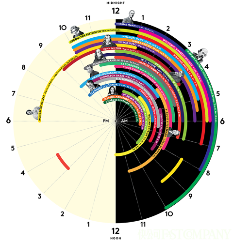 《纽约》(New York)杂志根据梅森·柯里(Mason Currey)的著作《创作者的日常生活》(Daily Rituals)中的内容创作了这幅伟人作息时间表。我们常听说天才都是工作到三更半夜的夜猫子,因为当人感到疲劳的时候最有创造力,不过这个图表显示的数据完全推翻了这个传言——在这27位伟人中,绝大多数都保持了8小时的充足睡眠。图表的设计简直是神来之笔,做成挂钟的样子,直接用色条标出每个人的睡眠时段,清楚明了、易于阅读。