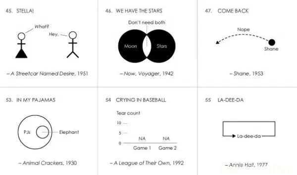 2005年,美国电影学会组织了1500名电影艺术家、影评人和历史学家评选出了100年来好莱坞电影中最令人印象深刻的电影对白。Flowing Data网站的南森•邱(Nathan Yau)把这些对白巧妙的做成了黑白卡通漫画表,图表中更是把各种表格的使用发挥得淋漓尽致,有文氏图、饼图、曲线图、柱形图、流程图等等。很少有人会用这样的形式来诠释语言对话,这也是这个图表的过人之处。