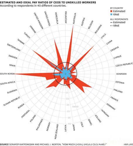 相信绝大多数的人都会认为CEO的收入是超高的。那究竟有多高呢? 这样来说吧,如果美国的普通工薪族以美国CEO的标准发工资的话,平均每个人每年都能有200万美元的收入。《哈佛商业评论》用图表直观得对比了公司高层与普通员工收入的巨大差距。