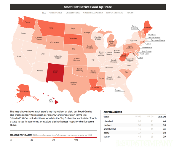 你有没有想过有些在你看来再正常不过的饮食习惯在其他地区的人看来却是十分诡异的?Co.Design版块的可视化数据设计师格斯·文茨瑞克(Gus Wezerek)和作家马克·威尔逊(Mark Wilson)与一家食品业资讯公司Food Genius一起合作,研究了8万8千份菜单和5千9百万个菜品制作出了这份美国各州最有特色的食品图表。这份图表中的食物并不是每个州最受欢迎的菜式,而是本州最有特色、独一无二的菜品。图表中还体现出了各地区5大类特别的饮食爱好,包括费城牛肉芝士三明治、青辣椒、灯笼椒、牧场沙拉和山核桃。图表统计的很全面,给我们展示了很多我们之前不知道的美国饮食文化。